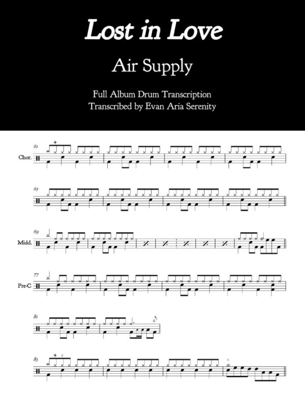 Drum sheet music transcriptions for the entirety of Air Supply’s 1980 breakthrough album, Lost in Love. Drums by Ralph Cooper. Soft rock, overall difficulty 3/5.