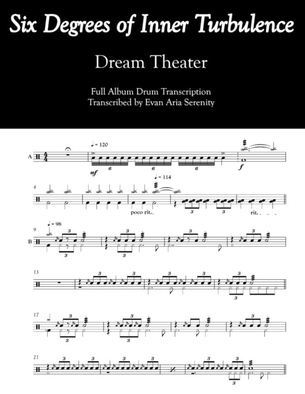 Drum sheet music transcriptions for the entirety of Dream Theater’s 2002 double album, Six Degrees of Inner Turbulence. Drums by Mike Portnoy. Progressive metal, overall difficulty 5/5.