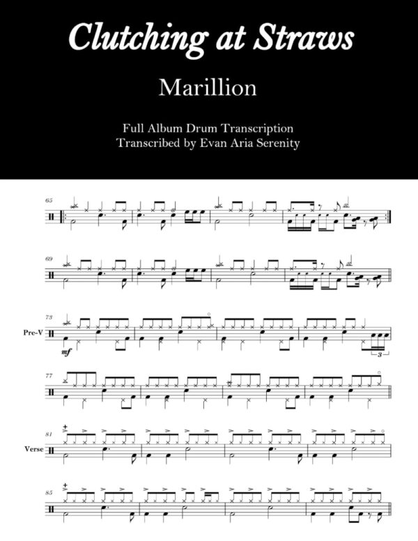 Drum sheet music transcriptions for the entirety of 1987’s Clutching at Straws, Marillion’s final release with Fish. Drums by Ian Mosley. Progressive rock, overall difficulty 4/5.