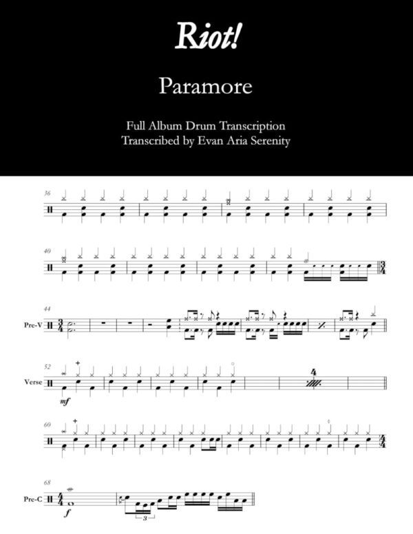 Drum sheet music transcriptions for the entirety of Paramore’s sophomore album Riot!, released in 2007. Drums by Zac Farro. Pop punk, overall difficulty 3/5.