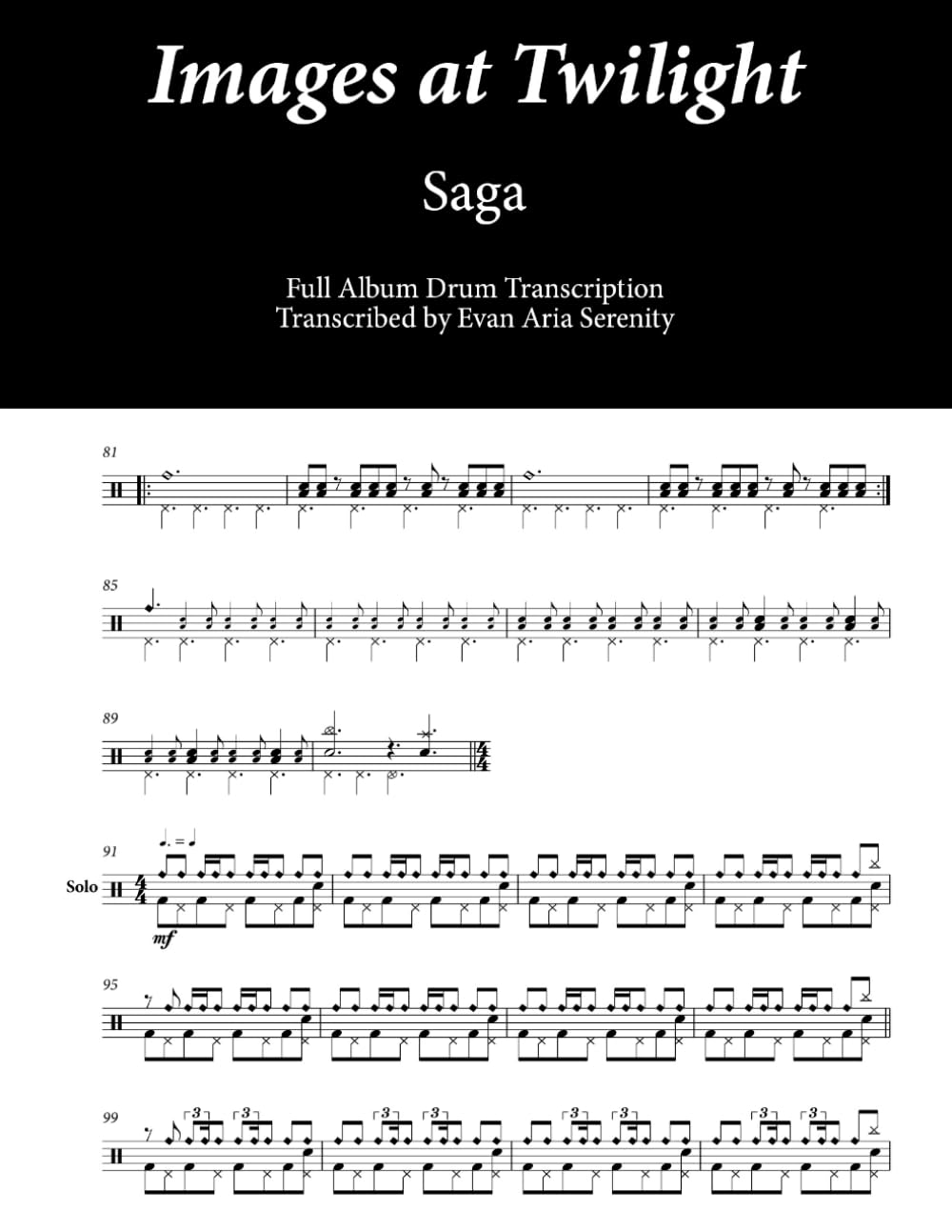 Drum sheet music transcriptions for the entirety of Saga’s 1979 album, Images at Twilight. Drums by Steve Negus. Crossover prog, overall difficulty 4/5.